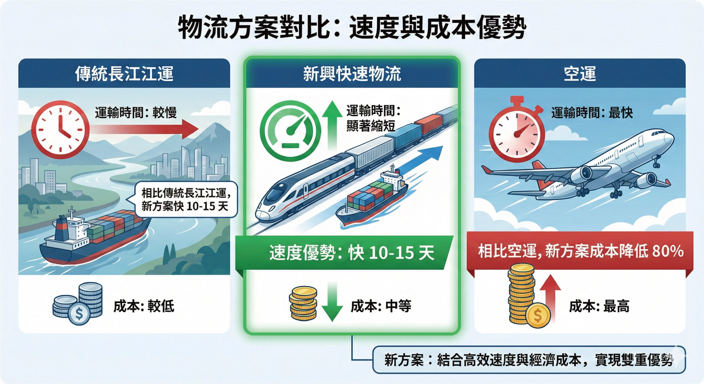 極致時效與成本平衡: 相比傳統長江江運快 10-15 天,相比空運則能大幅降低 80% 的成本。