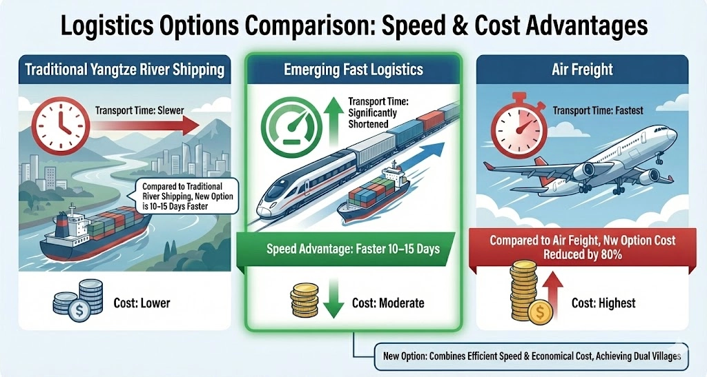 Optimized Balance of Speed and Cost: Compared with traditional Yangtze River feeder transport, transit times are shortened by 10–15 days, while costs are reduced by up to 80% relative to air freight.